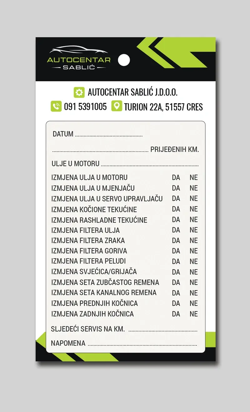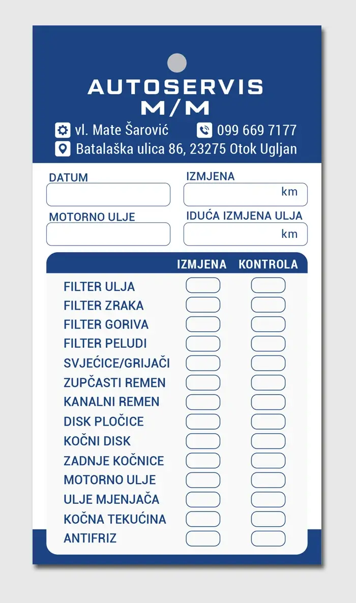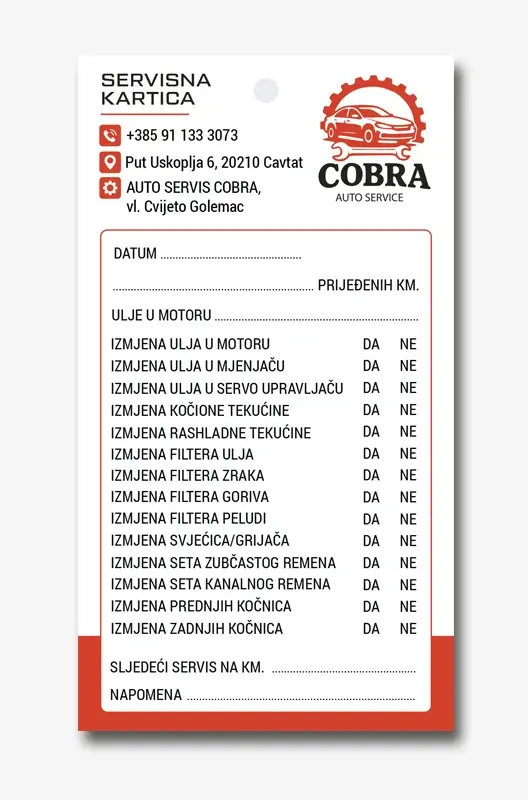 Profesionalni tisak servisnih kartica za izmjenu ulja idealan je za autoservise, vulkanizere i automehaničare koji žele pružiti bolju uslugu i ostaviti profesionalan dojam.