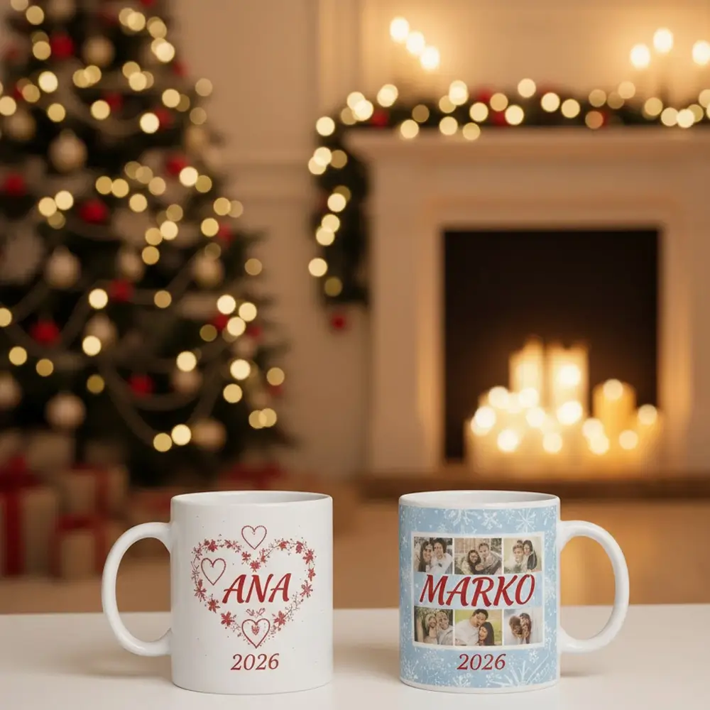 - Savršen poklon za parove! Dvije šalice s personaliziranim imenima i božićnim motivima – srca, pahuljice, zajedničke fotografije, sve što želite. Idealno za jutarnju kavu udvoje.
